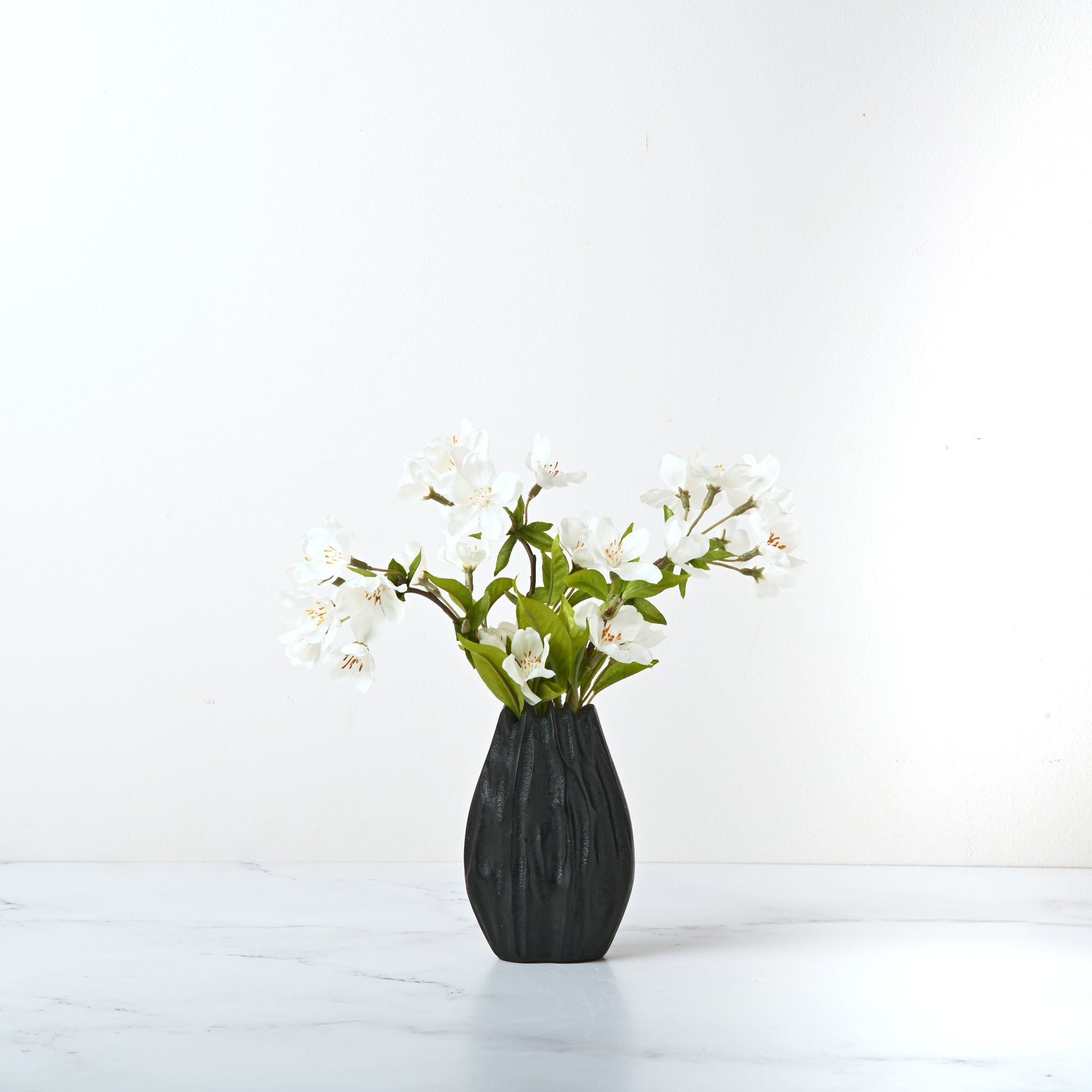 Sweet, delicate pear blossom flowers bounce gently in this sharp pouch shaped vase. The soft white flowers make for a dramatic contrast in the graphite black vase. Perfect for a dresser, bedside table, vanity, or empty corner.
