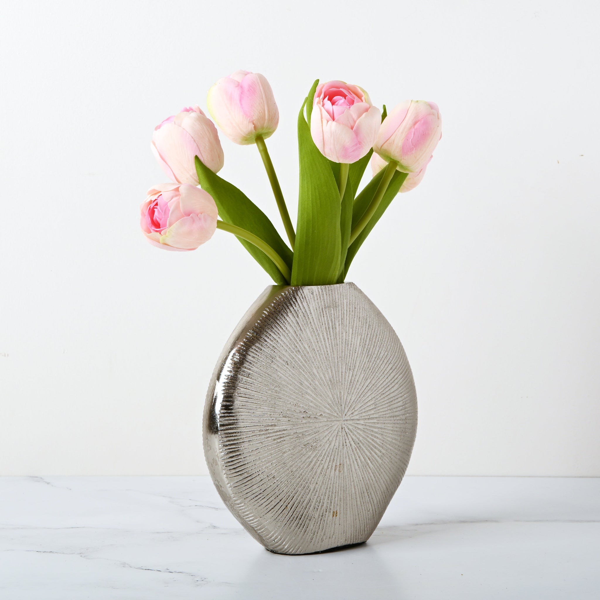 Garden snipped tulips bundled tightly in a sleek silver vase.